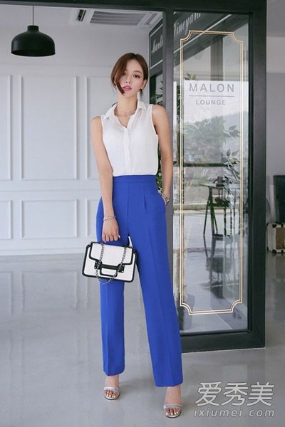 白色无袖衬衫采用轻盈的雪纺材质,知性中带着女人味,搭配宝蓝色长裤真是时髦极了,谁规定职业装就要穿的严肃呆板呢?兼顾干练和时尚才能彰显新人的穿衣品味。