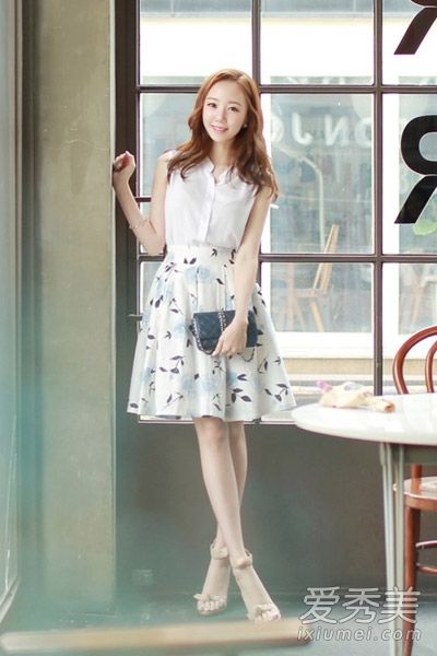 白衬衫清新唯美,搭配印花半身裙尽显淑女风,精致而有女人味的装扮,既适合上班,下班后穿着去约会也ok。